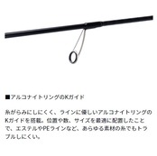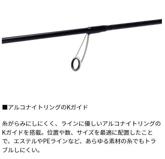 癖がなく使いやすい、ライトゲーム入門ロッド。アジングやメバリングを始めたいエントリーユーザーに最適なライトソルトウォーターゲーム用ロッド。癖のないしなやかなブランクによって、慣れるまで難しい軽量ルアーのキャストをスムーズに行うことができる。一方、負荷のかかるベリーからバットの部分には、ネジレ防止構造のブレーディングXを搭載。パワーロスが減少するので、キャストのコントロールが付けやすく、大物がかかったときも安心してやり取りできる。ガイドは糸がらみしにくいKガイドを最適なバランスで配置。視界が効きにくいナイトゲームや、風が吹く状況でも安心。