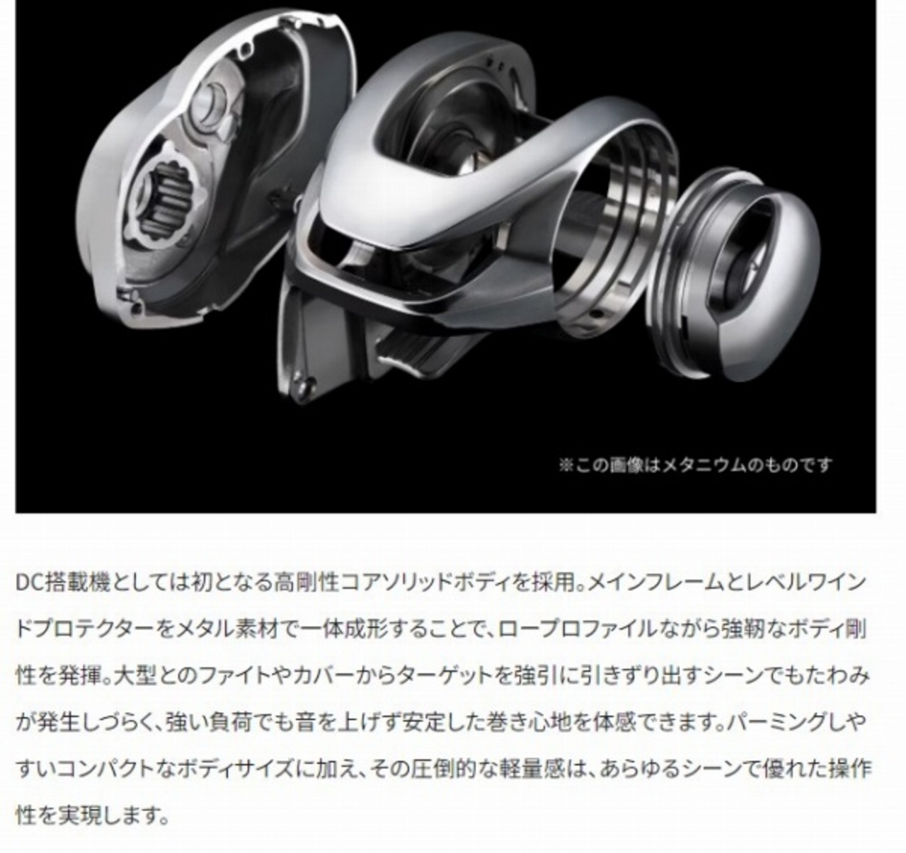 前作から9年、メタニウムDCがネオバーサタイル機として生まれ変わります。低慣性MGLスプール?は、立ち上がりの軽さ、伸びのバランスが良くバーサタイル性に優れる34/19mmを採用。ブレーキは、スプールの回転変化をマイコンにより瞬時に感知してブレーキ力を調整するDCブレーキを搭載。遠投性能と対バックラッシュ性能に優れるNEWファームウェアを採用。低振動化を図るS3Dスプール、サイレントチューンにより、キャスティングパフォーマンスを最大限に発揮します。また、滑らかな巻き上げのマイクロモジュールギアをX-SHIPで強固に支持。さらに、コアソリッドボディによる高剛性化と、自重の軽量化を両立しました。質感高く深みのある黒基調に仕上げた外観は、フィールドで映え、所有感を高揚させます。