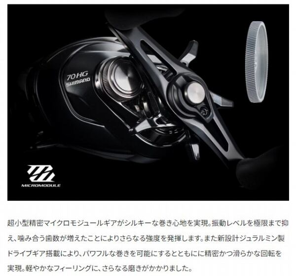 前作から9年、メタニウムDCがネオバーサタイル機として生まれ変わります。低慣性MGLスプール?は、立ち上がりの軽さ、伸びのバランスが良くバーサタイル性に優れる34/19mmを採用。ブレーキは、スプールの回転変化をマイコンにより瞬時に感知してブレーキ力を調整するDCブレーキを搭載。遠投性能と対バックラッシュ性能に優れるNEWファームウェアを採用。低振動化を図るS3Dスプール、サイレントチューンにより、キャスティングパフォーマンスを最大限に発揮します。また、滑らかな巻き上げのマイクロモジュールギアをX-SHIPで強固に支持。さらに、コアソリッドボディによる高剛性化と、自重の軽量化を両立しました。質感高く深みのある黒基調に仕上げた外観は、フィールドで映え、所有感を高揚させます。