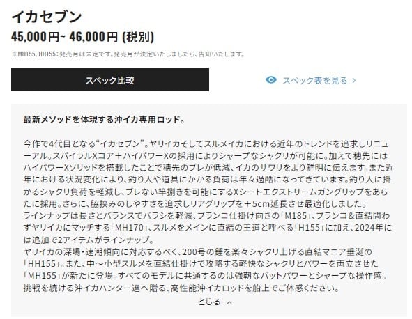 ラインナップは長さとバランスでバラシを軽減、ブランコ仕掛け向きの「M185」、ブランコ&直結問わずヤリイカにマッチする「MH170」、スルメをメインに直結の王道と呼べる「H155」に加え、2024年には追加で2アイテムがラインナップ。
