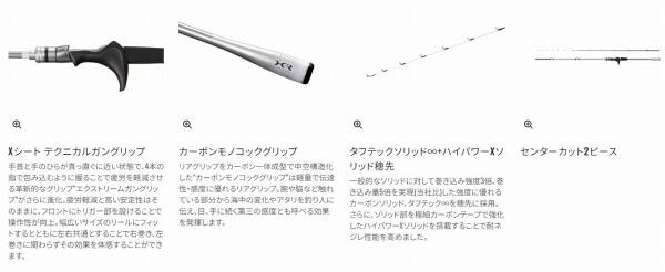 カーボンモノコックグリップ+Xシートテクニカルガングリップ搭載の高性能ゲームロッド。その感度と操作性は、価値ある一匹を手にするために。