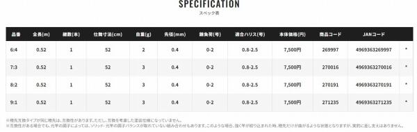 現行のシマノ筏ロッド、穂先互換タイプDに適合する替え穂先。近年の筏ロッドの傾向を反映したラインナップで、しなやかでありながら幅広いエリア・状況・釣法へオールラウンドに対応する。最も繊細な6:4、宙切り釣法にまで対応する7:3、オールラウンドの8:2、攻めのアプローチが可能な9:1と、想定される状況と多彩な釣り方に合わせて選べる4アイテム。繊細な穂先の表現力を追求するためにオリジナルワイヤーガイドを採用。また、破損を防ぐパイプケースを付属したNEWパッケージで不意の破損も防止。アングラーの好み合わせた調子選択で、筏釣りの世界を広げる。