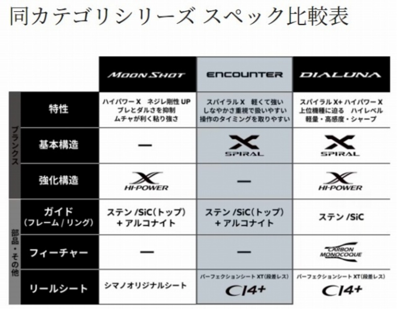 シーバスを代表にヒラメ、青物や回遊魚など多種多様なターゲットを攻略するショアキャスティングロッド「エンカウンター」。シマノ独自のテクノロジー[スパイラルX]を新たに採用し、ロッドパフォーマンスがさらに進化。高い強度を保持しつつ、軽さとパワーの両立を達成。またネジレとつぶれの剛性も高まることでブレやダルさが抑制され、しなやかな曲がりの中にシャープなフィーリングを実現。キャストのタイミングを掴みやすく、掛けたターゲットを全身で受け止めてコントロールできる、オートマチック感覚の性能が特徴。アイテムは様々なルアーに対応する幅広いレングスとパワーをラインナップ。フィールドは港湾、河川、防波堤、サーフや磯場など、近〜遠距離戦のあらゆるシーンに適応。