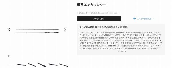 シーバスを代表にヒラメ、青物や回遊魚など多種多様なターゲットを攻略するショアキャスティングロッド「エンカウンター」。シマノ独自のテクノロジー[スパイラルX]を新たに採用し、ロッドパフォーマンスがさらに進化。高い強度を保持しつつ、軽さとパワーの両立を達成。またネジレとつぶれの剛性も高まることでブレやダルさが抑制され、しなやかな曲がりの中にシャープなフィーリングを実現。キャストのタイミングを掴みやすく、掛けたターゲットを全身で受け止めてコントロールできる、オートマチック感覚の性能が特徴。アイテムは様々なルアーに対応する幅広いレングスとパワーをラインナップ。フィールドは港湾、河川、防波堤、サーフや磯場など、近〜遠距離戦のあらゆるシーンに適応。