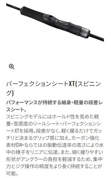 チューブラーならではの軽量・高感度・高レスポンスが特徴。そしてジャークの種類を選ばず小型ジグを的確に操れるオールラウンドな性能が魅力。基本となるワンピッチジャークでスライドやフォールのアクションを操ったり、緩急のある泳ぎを演出したりと、多彩なジグアクションで様々なターゲットを攻略。シマノ独自の基本構造スパイラルXコアによって高い強度と軽さの両立を実現。またブランクス細径化に伴うネジレやパワーロスなどの不快なフィーリングを抑制。