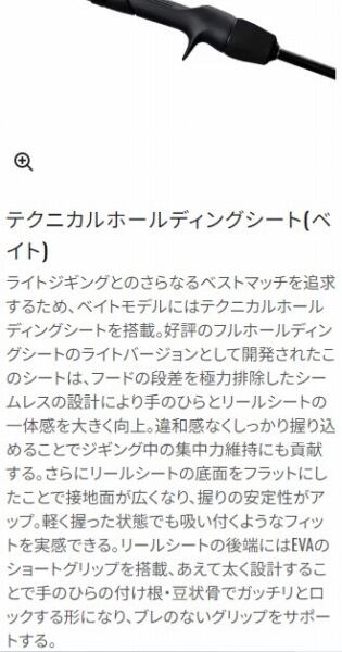 「曲げて獲る」エキサイティングなゲームを楽しむためのシリーズ。全身を曲げ込むほどに漲るような粘り強さを発揮し、安定感あるファイトをサポート。そしてジャークのタイミングを掴みやすく、ナチュラルなジグアクションを重視したワンピッチジャークや、直線的な泳ぎを演出するリーリングジャークなどに適応。ハイパワーXフルソリッド構造によってネジリ剛性を向上し、一般的なフルソリッドにありがちな不快なブレやパワーロスなどを徹底抑制。また素材には高強度カーボンソリッドタフテック∞を採用し、強度の向上も達成。
