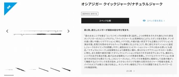 “意のままにジグを操る”というジギングの本質を深く追求し、2つの特性をそれぞれ進化させた新生オシアジガーのスピニングモデル。「クイックジャーク」は高弾性化によりレスポンス性を高め、テンポの速い誘いや鋭いジグアクションに特化。ドテラ流しや潮が速い状況下でも正確なジグアクションを演出可能。反発力を高めながらもティップは柔軟に仕上げることで、常に変化するテンションに追従しジャークのタイミングの把握しやすく、緩急あるコンビネーションジャークや小刻みな誘いにも適応。「ナチュラルジャーク」は低弾性化により柔軟性に優れ、滑らかなジグアクションやスローな誘いに特化。また浅場や潮流が緩くてダイレクトにテンションが伝わりすぎる状況下においても、艶めかしいジグの泳ぎを演出可能。曲げ込めば強靭なバットが真価を発揮し、ワイドなスライドアクションを演出できる対応力も備えている。この2シリーズともに、ブランクスを徹底的に細経化して全身が曲がって機能するようバランスを突き詰め、より少ない力でジグを操れる高次元のジャーク性能を達成。スパイラルXコアは軽さと強さを両立し、ネジレやすい細径化ブランクスの課題であるブレやパワーロスを徹底抑制。