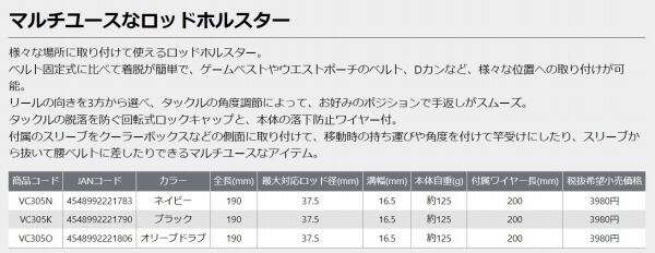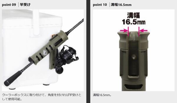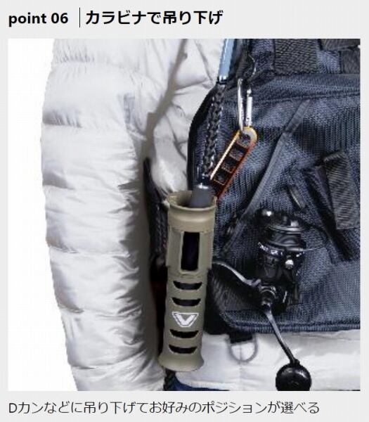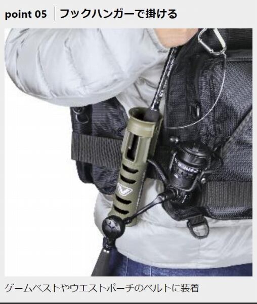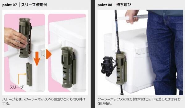 付属のスリーブをクーラーボックスなどの側面に取り付けて、移動時の持ち運びや角度を付けて竿受けにしたり、スリーブから抜いて腰ベルトに差したりできるマルチユースなアイテム。