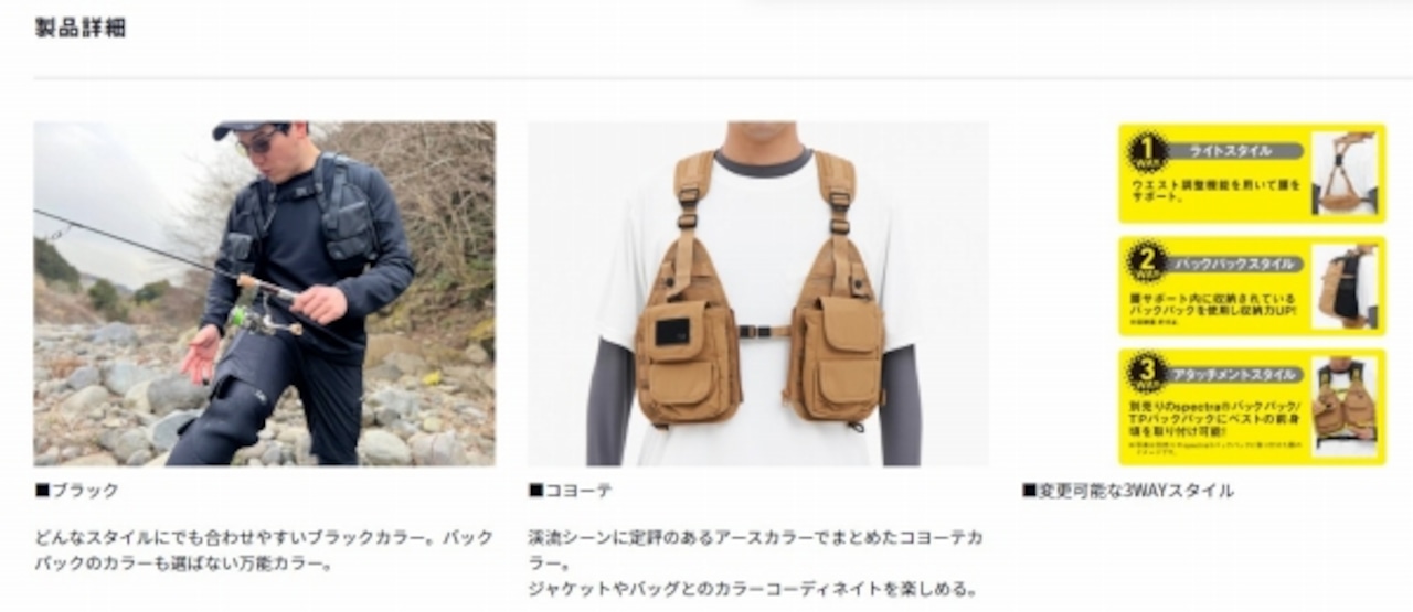 収納量に合わせてスタイルを変更可能なフィッシングベスト