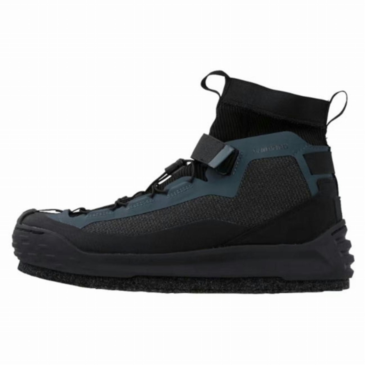 ロックショア用の理想的なシューズが欲しい、という目的から開発をスタート。足場の悪い磯場を長距離歩くロックショアでは履きごこちが大事です。そこで足型を新規設計してクッション性を高めるためのEVAを内蔵。歩行時にしっかりとフィットするように、クイックシューレースとベルトを併用してフィット感を高めました。ハイカットの履き口にはニット素材を採用し、足首部分の可動域を広げながらも、砂やゴミの侵入をシャットアウトします。またフィットすることにより、足からシューズへと一体化したシルエットが可能になりました。続いては耐久性。磯と干渉しやすいソールに近い部分にはラバーを多用し、アッパーのメイン生地には耐摩耗性のあるケブラー?を採用しています。また、極力縫製をしない構造で、擦れによる糸切れを軽減。重要なポイントは縫製をしていますが、磯と干渉しにくい一段落としたラインで縫製しています。ソールは定番のカットラバーピンフェルトを採用していますので渡船を使ったロックショアにも対応が可能。非防水タイプはソールを通しての排水なので、砂などのゴミも入りにくい構造です。