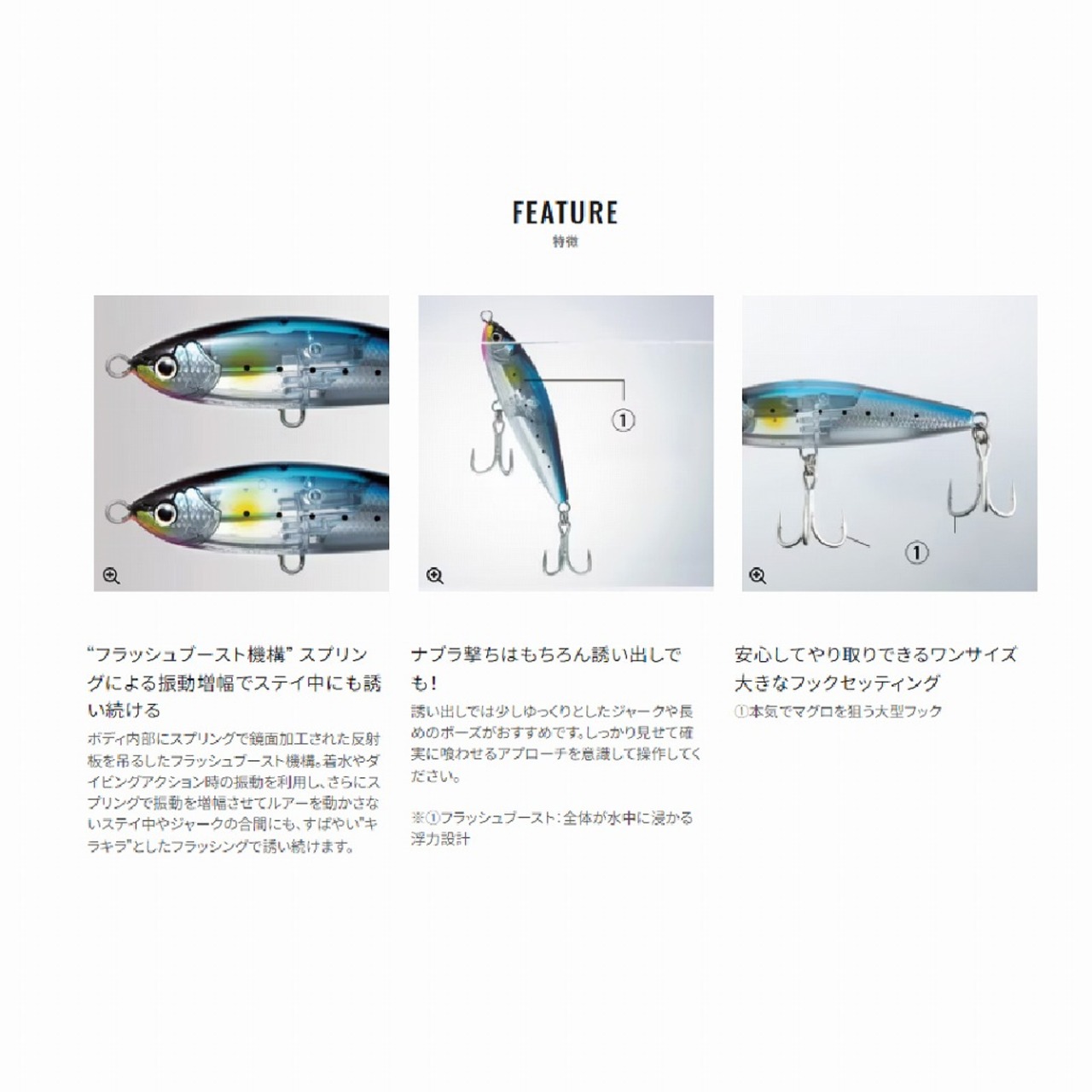 相模湾でキハダマグロを狙う上でシーズン前半のワンチャンスを逃さない飛距離。またハイシーズンのハミになった分厚いナブラでも、低浮力設計にすることで出来るだけルアー全体を水に浸らせ、さらにフラッシュブーストが輝き続けることでステイ中にも途切らせない強いアピール力。さらにシーズン後半に現れるビッグサイズや、津軽海峡のクロマグロでも安心してやり取りできるワンサイズ大きなフックセッティング。それらのマグロ狙いに必要な要素を全部盛り込んで開発されたのが、このヘッドディップ140Fフラッシュブーストです。