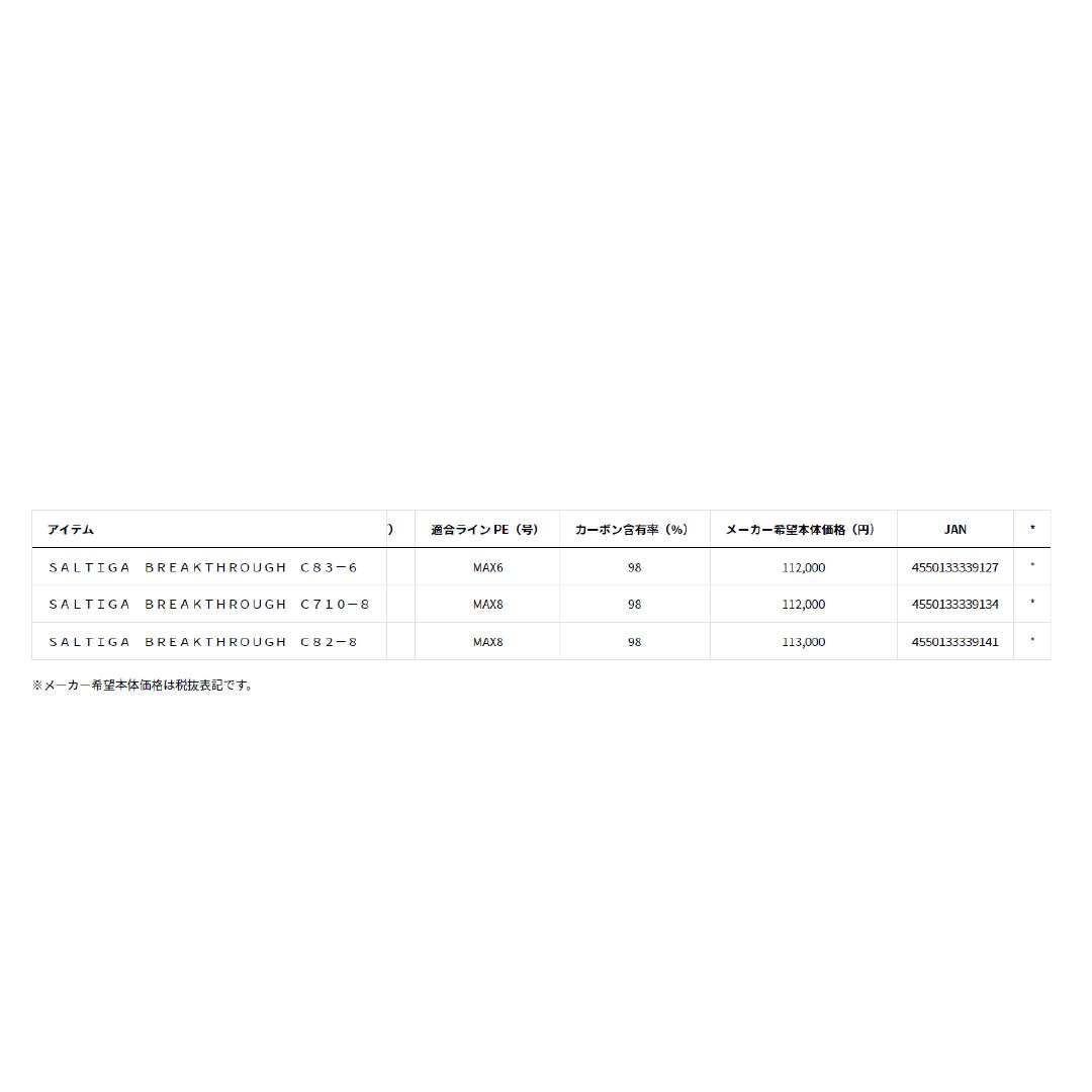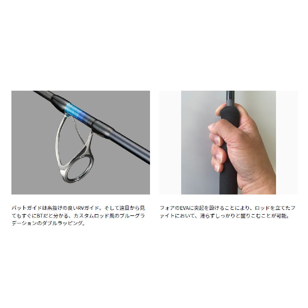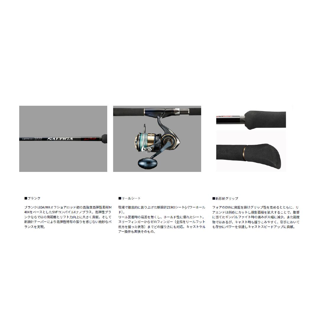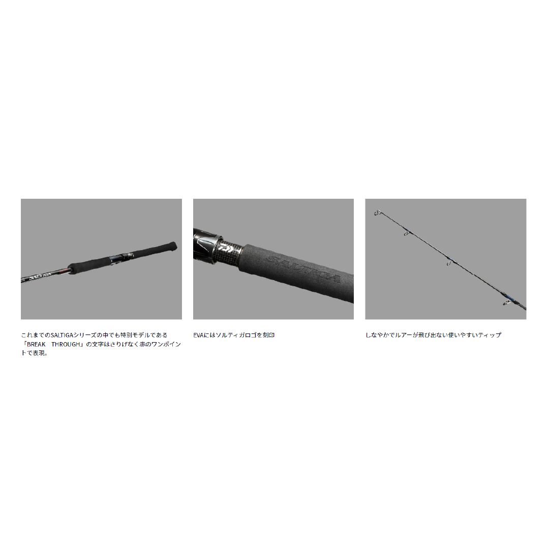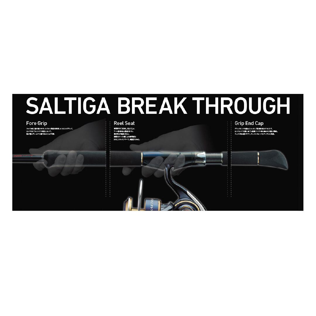 新設計高弾性ブランクがもたらす強い反発力は軽い力でも安定した飛距離を実現。また軽量なので、いつまでも気持ちよくキャストし続けられる。バットガイドはチタンRVガイドを装着し、糸抜けが向上した。そして新設計ZEROシートは、リール装着時の段差を無くしたことによりまさにストレスゼロ。スリーフィンガーからゼロフィンガー(全指をリールフット前方を握った状態)でのキャストやルアー操作も爽快そのもの。ファイト時は高弾性ブランクならではの突っ張りは皆無。曲がりの支点が負荷に応じてスムーズに移動し、強い反発力でしっかり魚を浮かせることが出来る。まさに「楽に、早く」魚を取り込むことが出来る。ファイト時のサポート機能として、フロントにグリップ先端に指を掛けやすいようにトリガー形状に。そしてグリップエンドは底面の面積を拡大することで、腹部に当てたファイトをしても痛くない新形状に仕上げている。[SALTIGA BREAKTHROUGH][24new01]