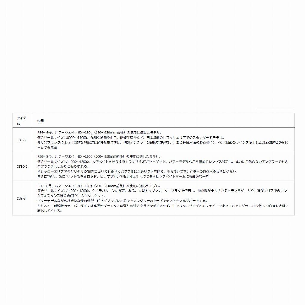 PE4号から6号、プラグサイズ60gから130g(180mmから230mm前後)に適したモデル。ダイビングペンシルの操作性に優れたヒラマサのセンターモデル。また水深のあるポイントで、細目のラインを用いた飛距離勝負のGTゲームでも活躍。適合リールサイズは8000から14000。