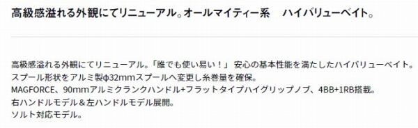 高級感溢れる外観にてリニューアル。「誰でも使い易い!」安心の基本性能を満たしたハイバリューベイト。アルミ製φ32mmスプール搭載。90mmアルミクランクハンドル&フラットタイプハイグリップノブ搭載。