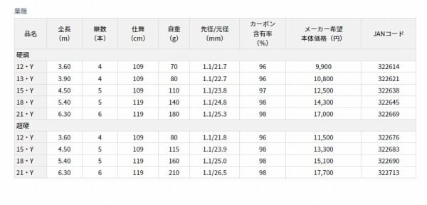 鮒・小物向けの“硬調”と鯉・堤防釣りまでカバーする“超硬”の2種の硬さに3.6〜6.3mの幅広いラインナップ
