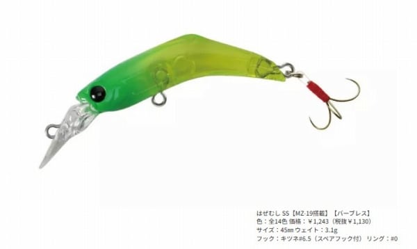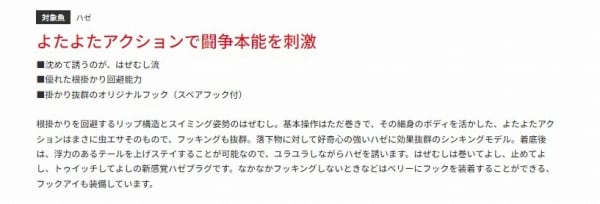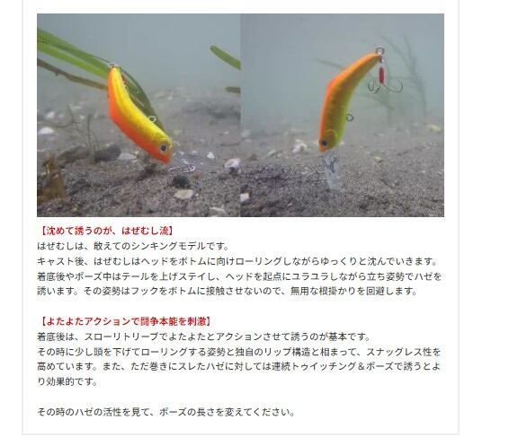 よたよたアクションで愉しむ、新感覚ハゼプラグ。根掛かりを回避するリップ構造とスイミング姿勢のはぜむし。基本操作はただ巻き。その細身のボディーを活かしたよたよたアクションは虫エサそのもの。日本製アユ針を3本イカリに仕上げた掛かり抜群のバスデイオリジナルを搭載。それでもフッキングしない時はベリーにフックを装着することができます。