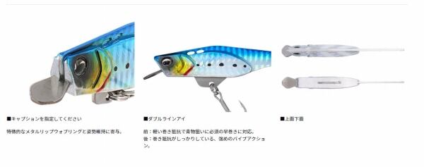 ヘビーウエイトミノーとメタルバイブのアクションを兼ね備え、頑丈さと飛距離をも兼ね備えたメタルビート!!ウォブリング:バイブレーション=7:3 のアクションで、安定した飛距離と軽い巻きごこちを実現。水平に近い遊泳姿勢で魚に見切られにくく、テール部の振れ幅とロールに近いバイブアクションが捕食スイッチを刺激する。ステンレスリップのニューオリジナルデザイン、今までにないミノーライクな鉄板系。樹脂製ヘビーミノーより細身でシルエットが小さく、ベイトが小さい時やセレクティブなときにも対応可能。魚の活性やレンジに合わせて、アクションの使いわけが出来るダブルラインアイ設定。