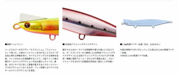 ●95mmボディに対して超高比重となる35g低重心固定ウエイト+ロケットのようなエアロシェイプに加え、横風の影響を受けにくい小型ヘッドフィンがロケットの小翼と同効果を果たし、キャスタビリィが圧倒的に向上。