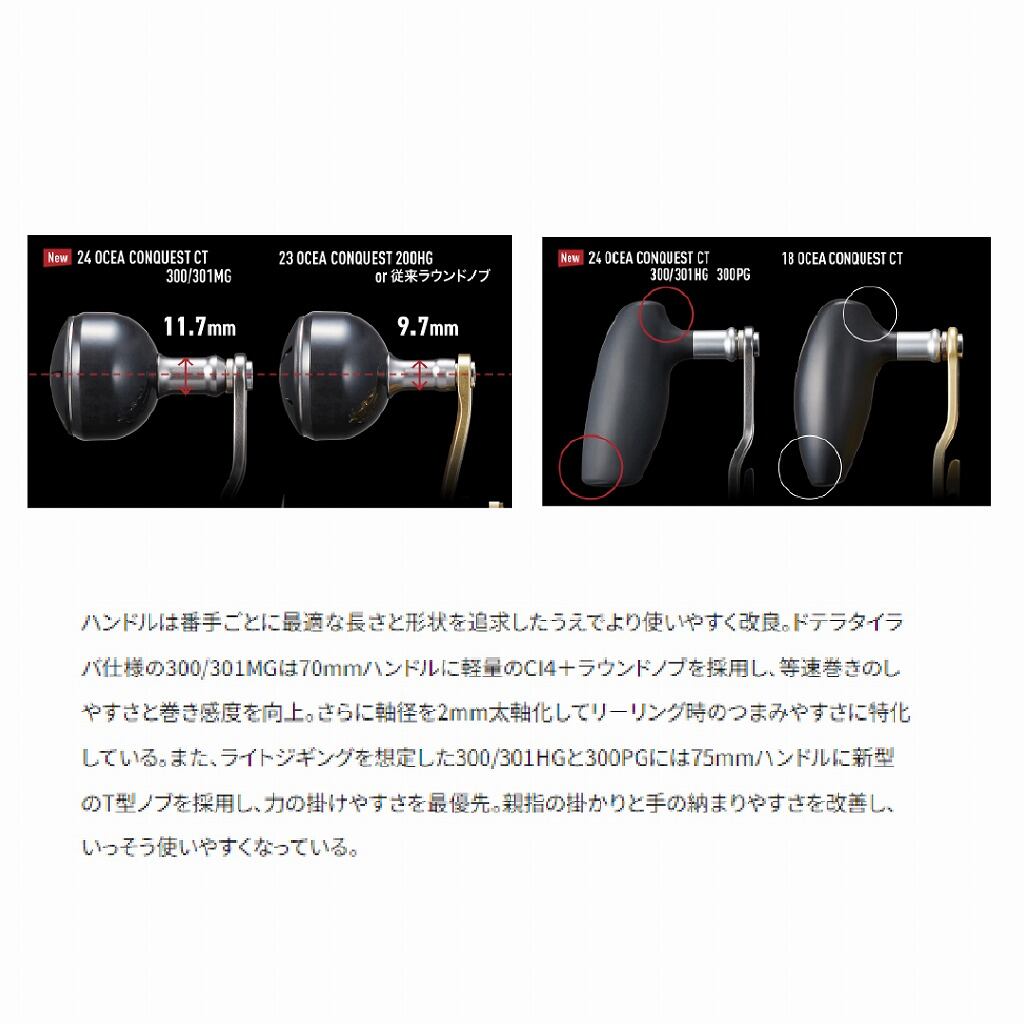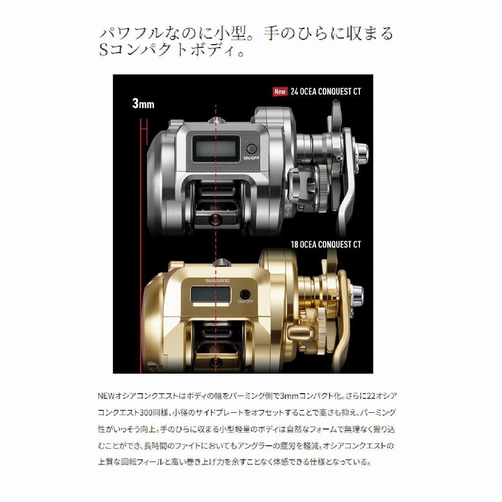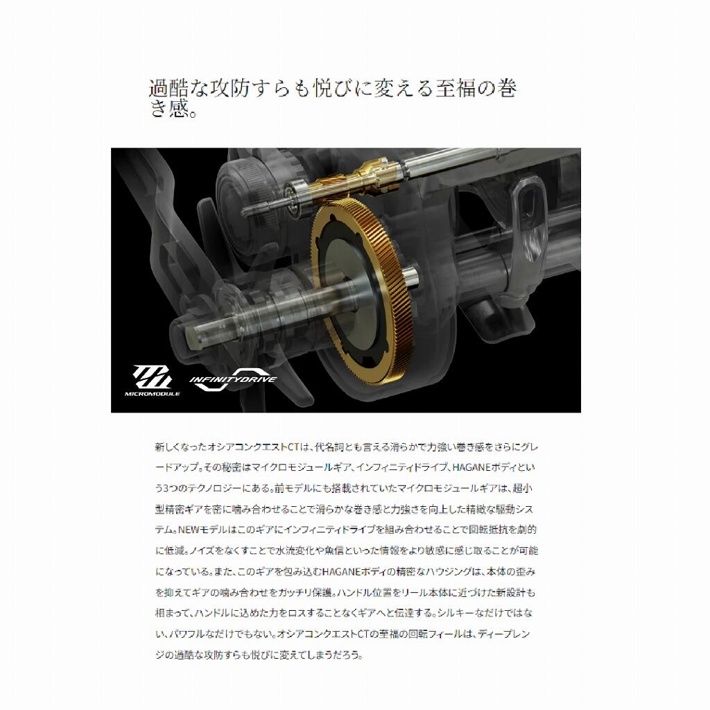 高精度金属ボディ&マイクロモジュールギアの剛健かつ滑らかな駆動系統にデジタルカウンターとフォールレバーを搭載し、高度な戦略とその再現性を実現するオシアコンクエストCT。NEWモデルはテンションを掛けても巻きが重くならない新型フォールレバーとインフィニティドライブを搭載し、巻きの軽さと感度がいっそう向上。さらに視野角が拡大したNEWラインカウンターには巻き上げ距離アラームを搭載し、より緻密な戦略をサポートする。もちろん高耐久クラッチ&高耐食ステンレスパーツがもたらす耐久性や、X-PROTECTによる防水性能など、オシアコンクエストが築き上げてきた鉄壁のタフネスは完全に踏襲。パーミングのしやすさ、カウンターの見やすさなど、細部にまで改良を加えた渾身のスペックでオフショアアングラーの期待に応える。新たにラインナップされたMGモデルはドテラ鯛ラバゲームにも最適なCI4+ラウンドハンドルノブを採用。