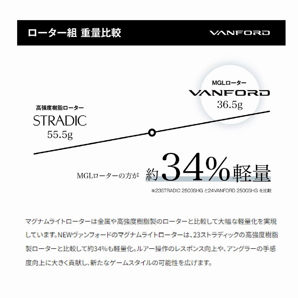 軽快さとリーリングのレスポンスを追求したマグナムライトシリーズの中核モデルとして、テクニカル系、フィネス系をはじめ幅広いゲームで活躍するヴァンフォード。NEWモデルは前作の軽快な操作性と感度、心地良い巻き感を受け継ぎつつも、インフィニティクロス、インフィニティドライブの搭載でパワフルな巻き上げとギアの耐久性がいっそう向上。耐摩耗性に優れたデュラクロスの採用により、ドラグの耐久性もシマノ基準で従来比約10倍と大きく向上しています。また、新搭載のアンチツイストフィンがライントラブルを抑制し、快適な使いごこちがさらに加速。新登場のC2500SXGを含む全13アイテムはエリアトラウト、バスフィッシングからエギング、シーバス、ショアジギングまでをカバーし、新時代のルアーゲームにふさわしいラインナップとなっています。