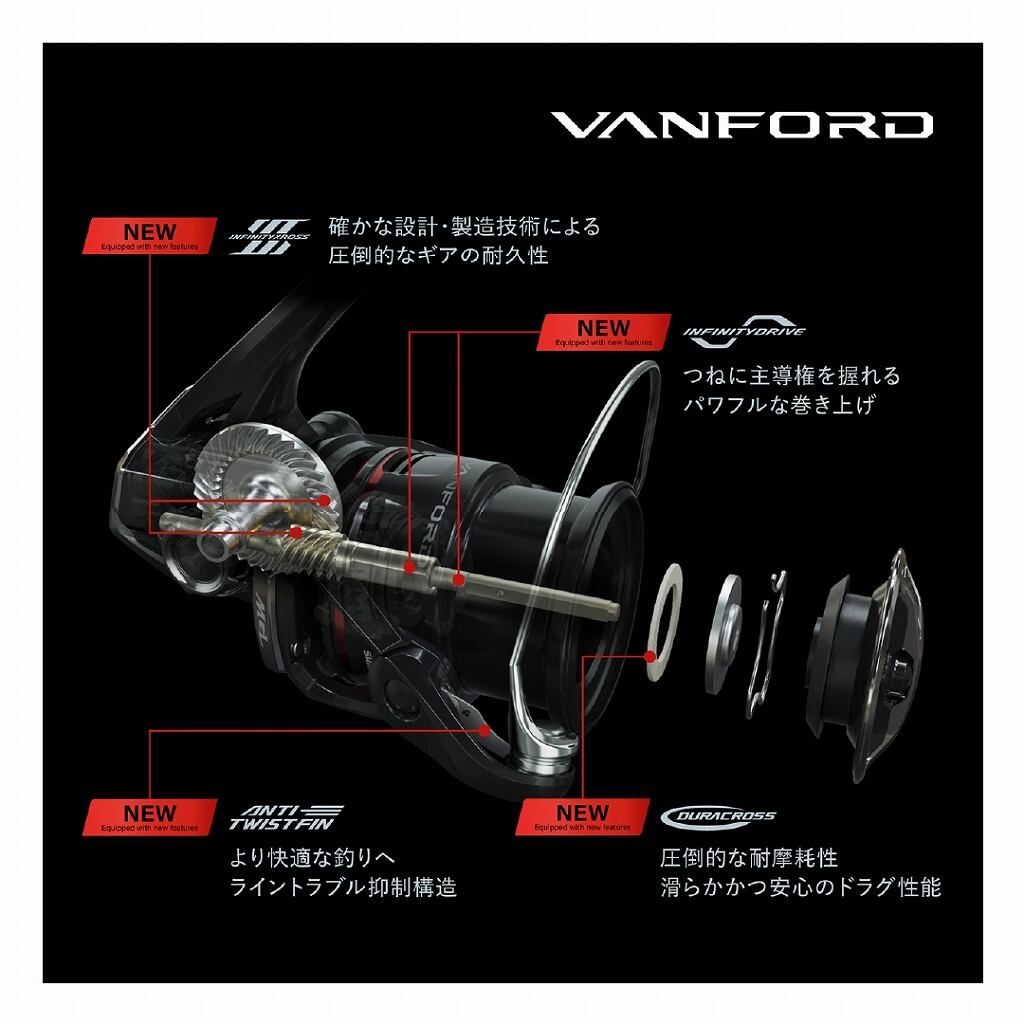 軽快さとリーリングのレスポンスを追求したマグナムライトシリーズの中核モデルとして、テクニカル系、フィネス系をはじめ幅広いゲームで活躍するヴァンフォード。NEWモデルは前作の軽快な操作性と感度、心地良い巻き感を受け継ぎつつも、インフィニティクロス、インフィニティドライブの搭載でパワフルな巻き上げとギアの耐久性がいっそう向上。耐摩耗性に優れたデュラクロスの採用により、ドラグの耐久性もシマノ基準で従来比約 10 倍と大きく向上しています。また、新搭載のアンチツイストフィンがライントラブルを抑制し、快適な使いごこちがさらに加速。新登場のC2500SXGを含む全 13アイテムはエリアトラウト、バスフィッシングからエギング、シーバス、ショアジギングまでをカバーし、新時代のルアーゲームにふさわしいラインナップとなっています。