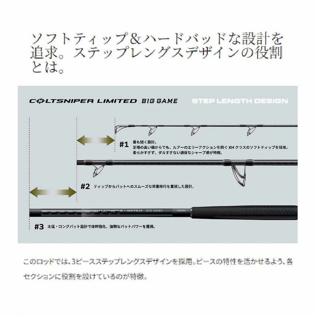 過酷なロックショアに判然たる意志で挑み、夢を渇望するアングラーに捧げるビッグゲームロッド。レコードフィッシュをバイトに持ち込むための「操作性」、不屈の「高強度」、最高レベルの「パワー」、アンバランスなラインシステムに対する「トラブルレス性能」など、ハードワークが要求されるビッグゲームロッドの性能を徹底追求。豪快さと繊細さの融合を求めて[並継]・ [ステップレングスデザイン]を採用し、#1はソフトティップ設計を採用。あらゆる変化のタイミングを掴みやすく、また短くすることで軽快性とレスポンスを向上。#2は硬さのギャップがある#1と#3をスムーズに荷重移行させるセクション。#3は太径・高剛性化することで体幹を強化し、モンスターサイズとの真っ向勝負のパワーファイトをサポート。離島遠征への利便性のみを意図した3ピース設計にあらず、高次元の強度とバランスを実現。また、MAXリールサイズ:SW18000番、PE:8〜10号を想定したタックルシステムに対応するために新規サイズの[Xガイドタッチフリーチタン]を採用。ライン放出時のバタつきを素早く収束させ、さらにトップ側のガイドリングサイズを従来よりも大口径化することで、ライントラブルレスとスムーズな糸抜けを実現。これにより、意図した方向へのキャスト精度、必要不可欠な飛距離を確保し、常にアングラー側が不利な立場に立つことが多いロックショアシーンを絶大な安心感でサポートする。