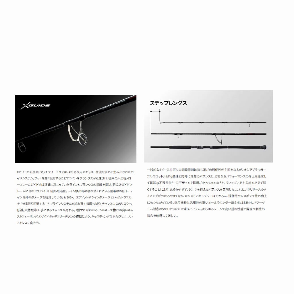 もっと強く、もっと遠くへ、そしてトラブルレスに。キャスティングゲームに求められる基本性能がさらに進化した新生オシアプラッガーフルスロットル。本質であるブランクスは、反発力を高めながらも曲がりのバランスを突き詰め、ブランクス全身が弓のごとく曲がることでエネルギーがスムーズかつ高効率に伝達され、アングラーの負担を低減しつつ安定したフルキャストとパワーファイトをサポート。そして新たにシマノ独自のXガイドタッチフリーチタンを採用し、キャスト性能が飛躍的に向上。リールから超高速で放出されていくラインのブランクスタッチを抑え、ノンストレスで突き抜けていくようなキャストフィールを実現。さらにアングラーが恐れるライントラブルやラインダメージも抑制。全ては誰よりもキャストを続け、一瞬のチャンスをつかむために。
