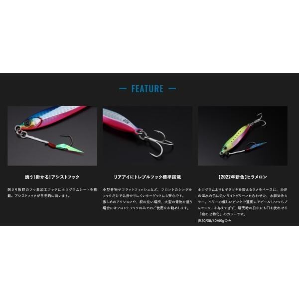 10g~60gの幅広いラインナップで、堤防やサーフ、河口など日本全国あらゆるフィールドに対応。使い方も簡単な上に適度な引き抵抗があるため、ショアジギングのビギナーから中上級者まで安心してご使用いただけます。
