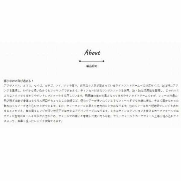 アジやメバル、カマス、セイゴ、カサゴ、ソイ、メッキ等々、近年益々人気が高まっているライトソルトゲームへの対応サイズ。1gは特にアジングを重視し、わずかな吸い込みでもフッキングできるよう、ティンセル付きのシングルフックを採用。3g・5gは汎用性を重視し、じゃれつくようなアタリでも掛かりやすいトレブルフックを採用しています。飛距離の差が釣果となって表れやすいライトゲームですが、シリーズ共通の飛び過ぎ性能で港湾はもちろん河口やちょっとした磯場など、極小ルアーが使いにくいようなフィールドでも快適に使え、今まで届かなかった群れにもルアーを送り込むことができます。また、フリーフォールの早さも魅力のひとつになります。他のルアーに比べ短時間でレンジを合わせることができ、魚の居るレンジが深い状況下では大きなアドバンテージになります。さらにラインにテンションを掛けるカーブフォールではボディを左右にロールさせながら沈むため、フォールでの誘いを意識した使い方も可能。フリーフォールとカーブフォール上手く組み込むことによって、素早く狙った