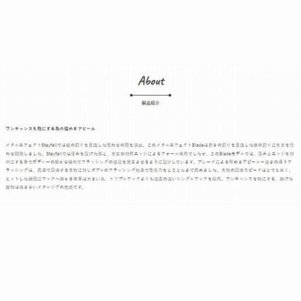 メタルエフェクトStayfallでは縦の釣りを意識した喰わせの間を演出。このメタルエフェクトBladeは巻きの釣りを意識した横の釣りに焦点を合わせ開発しました。Stayfallでは窪みを設けた面と、左右非対称エッジによるフォール専用でしたが、このBladeモデルでは、窪みとエッジを対照にする事でボディーの細かな揺れでフラッシングの強弱を発生させるように設計しています。