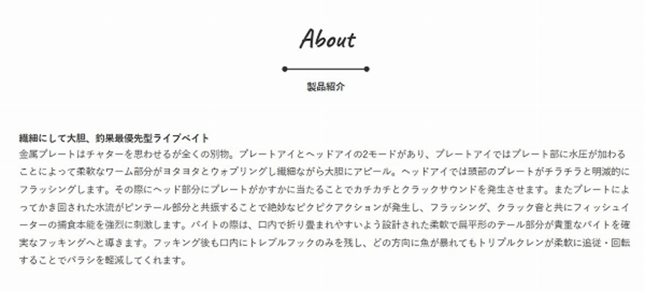 金属プレートはチャターを思わせるが全くの別物。プレートアイとヘッドアイの2モードがあり、プレートアイではプレート部に水圧が加わることによって柔軟なワーム部分がヨタヨタとウォブリングし繊細ながら大胆にアピール。ヘッドアイでは頭部のプレートがチラチラと明滅的にフラッシングします。その際にヘッド部分にプレートがかすかに当たることでカチカチとクラックサウンドを発生させます。またプレートによって撹拌された水流がピンテール部分と共振し絶妙なピクピクアクションが発生し、フラッシング、クラック音と共にフィッシュイーラーノ捕食本能を強烈に刺激します