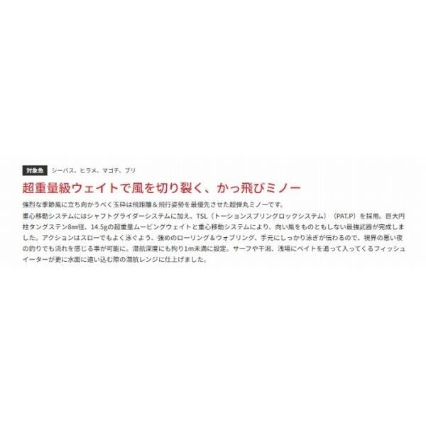 強烈な季節風に立ち向かうべく、玉砕は飛距離&飛行姿勢を最優先させた超弾丸ミノーです。重心移動システムには従来のシャフトグライダーシステムに加え、新機構TSL(トーション スプリング ロックシステム)(PAT.P)を採用。ムービングウェイトに、バスデイ開発史上初となる8mm径14.5gの円柱タングステンを搭載。超重量ムービングウェイトと新機構により、向い風をものともしない最強武器が完成しました。