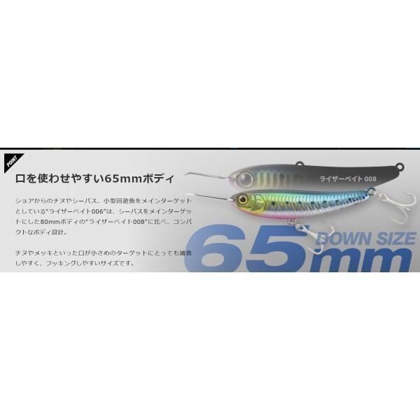 ショアからのチヌやシーバス、小型回遊魚をメインターゲットとしているライザーベイト006は、シーバスをメインターゲットにした80mmボディのライザーベイト008に比べ、コンパクトなボディ設計。