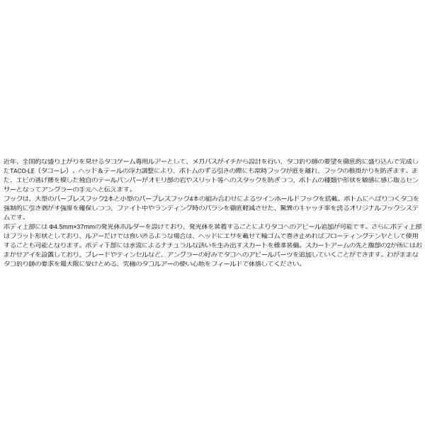 ガバスが提案する、タコのハイブリッドゲーム。近年、全国的な盛り上がりを見せるタコゲーム専用ルアーとして、メガバスがイチから設計を行い、タコ釣り師の要望を徹底的に盛り込んで完成したTACO-LE(タコーレ)。ヘッド&テールの浮力調整により、ボトムのずる引きの際にも常時フックが底を離れ、フックの根掛かりを防ぎます。