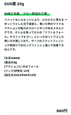 ファットなシルエットにより、ひらひらと落ちるゆっくりとした沈下速度と、巻いた時のワイドなアクションが魅力のスロージギング向きメタルジグです。