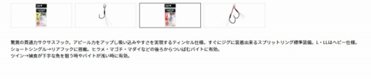 10〜80gのショアメタルジグに対応。シングル・ショートシングル・ツインの3タイプ。驚異の貫通力サクサスフック。アピール力をアップし吸い込みやすさを実現するティンセル仕様。すぐにジグに装着出来るスプリットリング標準装備。L・LLはヘビー仕様。