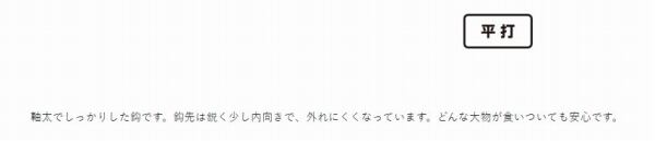 軸太でしっかりした鈎です。鈎先は鋭く少し内向きで、外れにくくなっています。どんな大物が食いついても安心です。