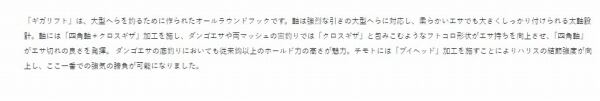 「ギガリフト」は、大型へらを釣るために作られたオールラウンドフックです。軸は強烈な引きの大型へらに対応し、柔らかいエサでも大きくしっかり付けられる太軸設計。軸には「四角軸+クロスギザ」加工を施し、ダンゴエサや両マッシュの宙釣りでは「クロスギザ」と包みこむようなフトコロ形状がエサ持ちを向上させ、「四角軸」がエサ切れの良さを発揮。ダンゴエサの底釣りにおいても従来鈎以上のホールド力の高さが魅力。チモトには「ブイヘッド」加工を施すことによりハリスの結節強度が向上し、ここ一番での強気の勝負が可能になりました。