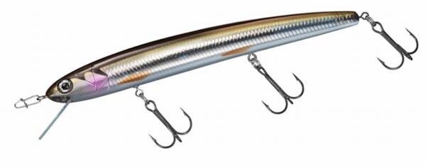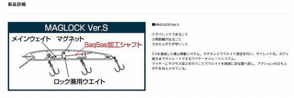 泉和摩が求めるミノーの要素は、(1)細身ボディであること。(2)ベイトタックルで遠投ができること。 (3)サイレントであること。細身のボディにすることで明らかにバイト数が増えるという。細いミノー を飛ばすため、重心移動を搭載し、サイレント化を達成するため、MAGLOCK Ver.Sを採用した。釣 れるミノーの要素をふんだんに盛り込んだミノーの最終形態がここに登場。