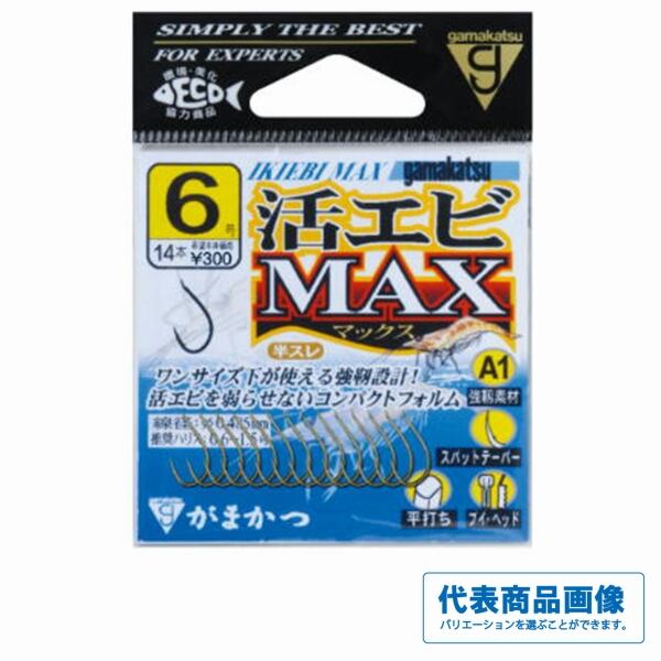 フッキング性能を飛躍的に向上させた鈎先のアングル。エビを弱らせない、かつ強度を確保するため、線径とサイズを細分化設定し、活エビを最大限(MAX)に生かし、1ランク下のサイズが使える強靱設計。メバルやハネ、チヌなどあらゆるエビ撒き釣りに最適な鈎です。