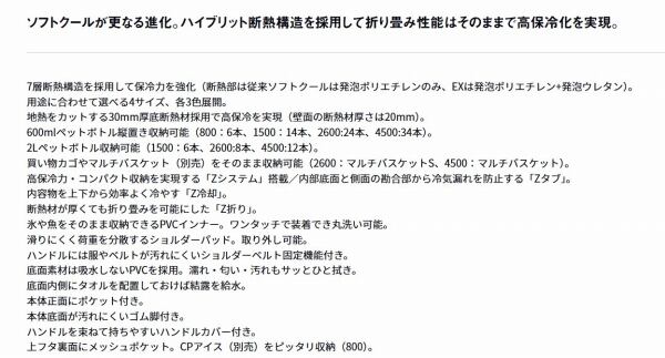 7層断熱構造を採用して保冷力を強化(断熱部は従来ソフトクールは発泡ポリエチレンのみ、EXは発泡ポリエチレン+発泡ウレタン)。
