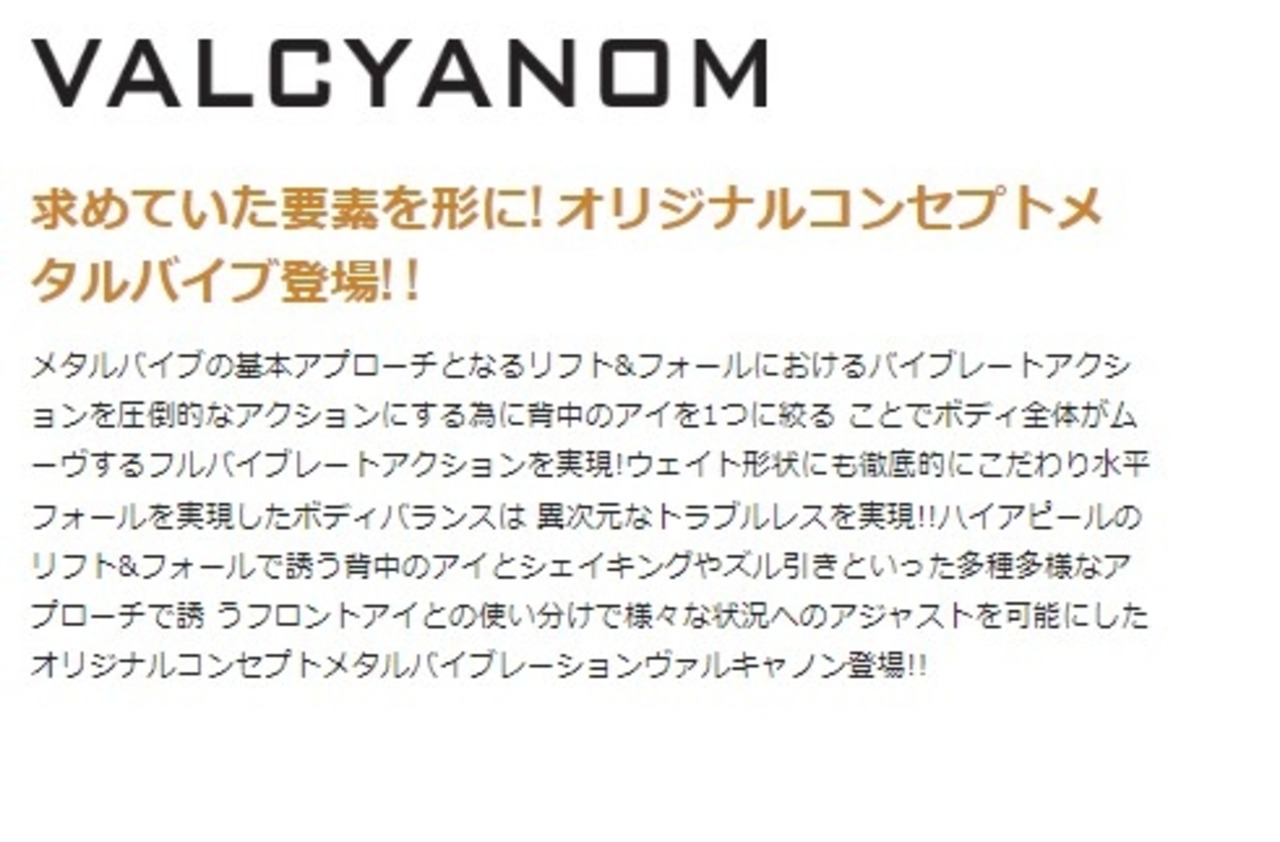 メタルバイブの基本アプローチとなるリフト&フォールにおけるバイブレートアクションを圧倒的なアクションにする為に背中のアイを1つに絞る ことでボディ全体がムーヴするフルバイブレートアクションを実現!ウェイト形状にも徹底的にこだわり水平フォールを実現したボディバランスは 異次元なトラブルレスを実現!!ハイアピールのリフト&フォールで誘う背中のアイとシェイキングやズル引きといった多種多様なアプローチで誘 うフロントアイとの使い分けで様々な状況へのアジャストを可能にしたオリジナルコンセプトメタルバイブレーションヴァルキャノン登場!!