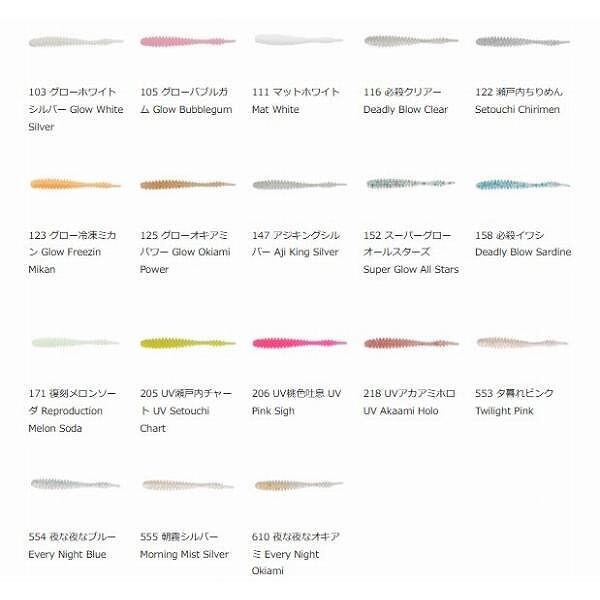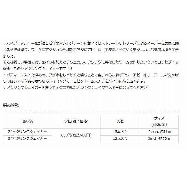 シェイキングに特化したワーム! ●ハイプレッシャー化が進む近年のアジングシーンにおいては、ワームにアクションを加えてアピールしなければアジの反応を得られないテクニカルな場面が増えてきました。そんな難しい状況で効果的なシェイキングに特化したワームとして開発されたのが、この3”アジリングシェイカーです。●3”アジリングシェイカーはシェイクを加えると大きな波動とロングワーム特有のボディがウネウネと波打つアクションを発生させることでアピール力が高まりアジに口を使わせます。アジが捕食するベイトサイズが大きくなる時期やディープエリアでのバチコンなどでお勧めです。●特有のウネウネアクションを演出するにはスプリットやキャロライナリグがお勧めですが、アジが捕食するベイトが大型の時期にはジグ単で使ってみて下さい。メモリアルフィッシュとの出会いがあること間違いなしです。