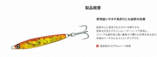 後部中心に設定されたボディを鮮やかな反射光を生むクラッシュレーザーシートで武装し、シャープな操作性と高い集魚力で優れた釣果を生み出す、本格のバーチカル&スイミングジグです。