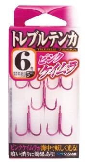 ●ピンクケイムラ発光のトレブルフック。ルアー、エサ釣りといろいろな釣りで活躍します。