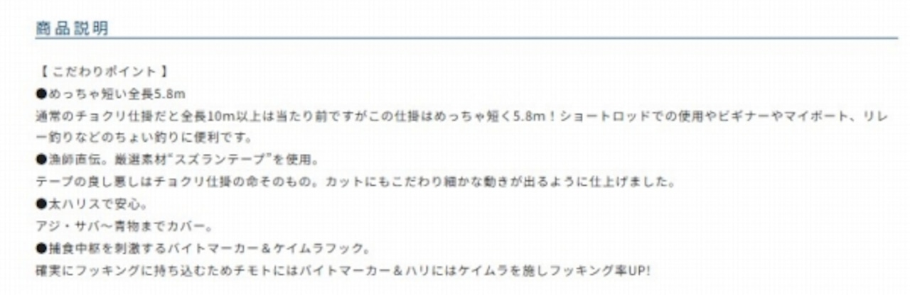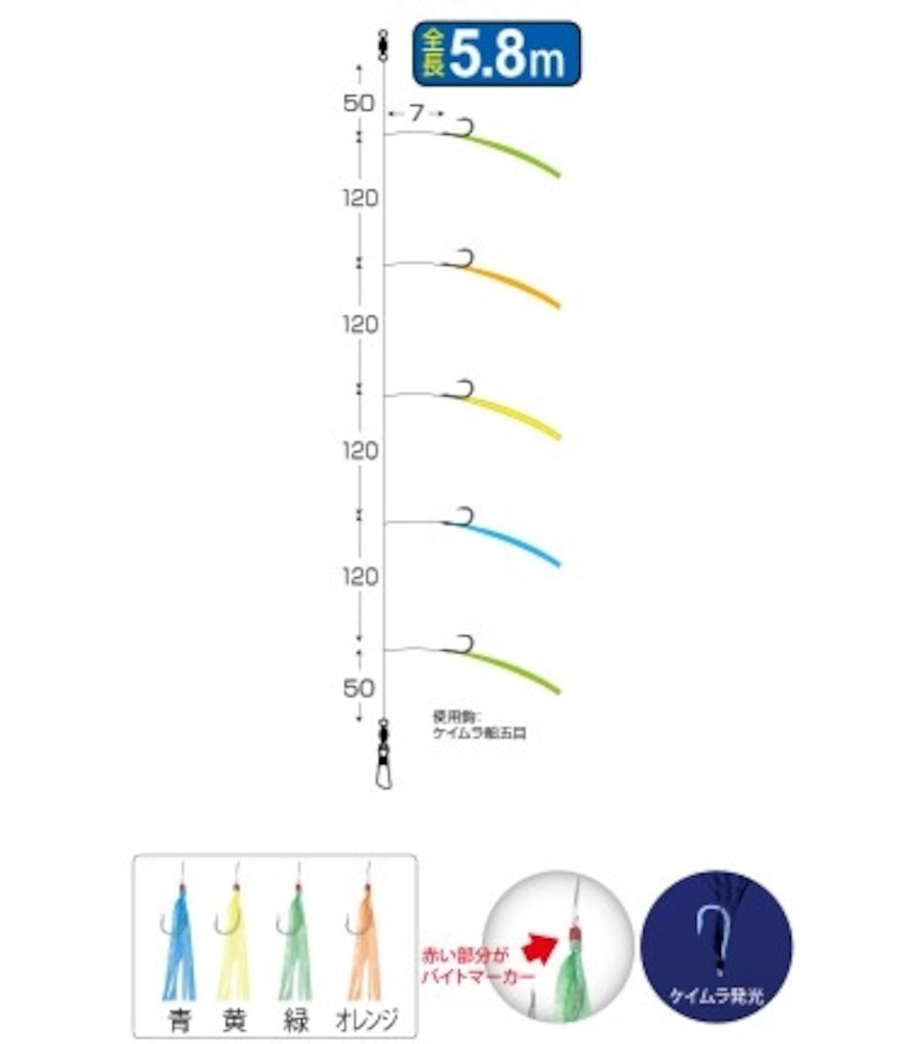 通常のチョクリ仕掛だと全長10m以上は当たり前ですがこの仕掛はめっちゃ短く5.8m!ショートロッドでの使用やビギナーやマイボート、リレー釣りなどのちょい釣りに便利です。