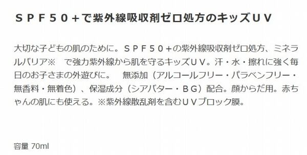 ミネラルバリア*で守る紫外線吸収剤ゼロ処方のキッズUV。*紫外線散乱剤を含むUVブロック膜●のびが良くべたつかない。●保湿成分配合(シアバター・BG)。肌もちもち。●汗・水に強いウォータープルーフ。●砂がつきにくいサンドプロテクト。
