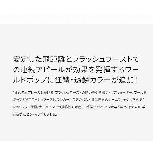 “止めてもアピールし続ける”フラッシュブーストの能力を引き出すトップウォーター、ワールドポップ69Fフラッシュブースト。ランカークラスのバスと共に世界のゲームフィッシュを見据えた#5フック仕様。太いラインでの操作性を考慮し、首振りアクションが容易な水平気味の浮き姿勢にセッティングしました。