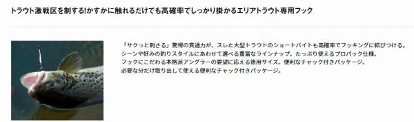 トラウト激戦区を制する!かすかに触れるだけでも高確率でしっかり掛かるエリアトラウト専用フック■「サクっと刺さる」驚愕の貫通力が、スレた大型トラウトのショートバイトも高確率でフッキングに結びつける。■シ
