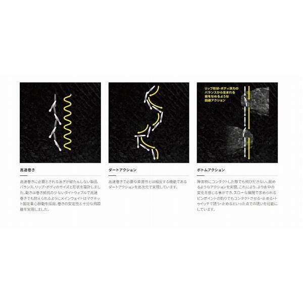 ジャークアシストバランサーの採用により、高速巻き、ダートアクション、安定性の高いボトムコンタクトをひとつのルアーで実現。従来であれば、リトリーブ時に姿勢が安定しやすく高速で巻けるタイプと、ジャーク時に